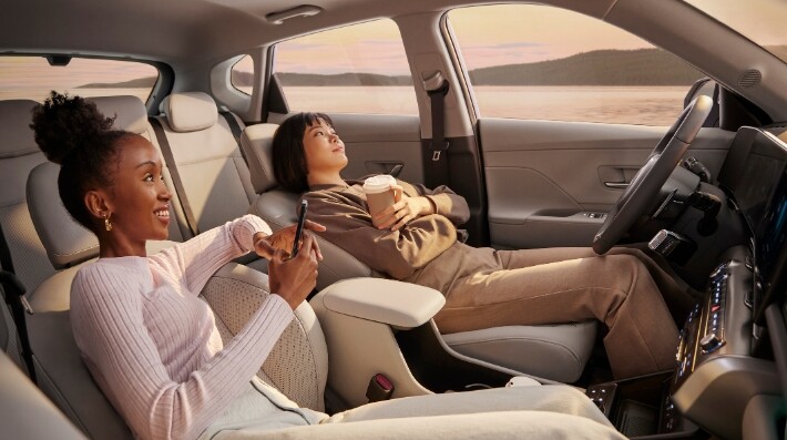 Slimmer front seats now allow you to relax in style. Lean back in the optimal angle for a more cozy, comfortable in-car experience. When stopping to charge, put the seat back into relaxation mode and recharge your batteries at the same time as your KONA.